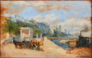 This hastily sketched vignette of workmen by the Pont de Saint-Pères is typical of Lépine both in his wanderings around Paris and his highly impressionistic approach to painting which is particularly apparent in this sketch. It is both finely detailed, enough to work out where on the Seine it is, but also very emotive and atmospheric. The little panel was presumably completed on the spot and some of his more finished views of the Seine are not quite so freely rendered. His reaction to both the place and weather conditions are very present in this panel and we can hear the chatter of the workmen as they shovel sand, as well as the loud hissing from the steam engined heavy excavation machine.