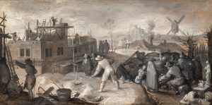 This early seventeenth century construction site shows us different stages of building. It is a highly unusual painting and was possibly a commission from a guild.