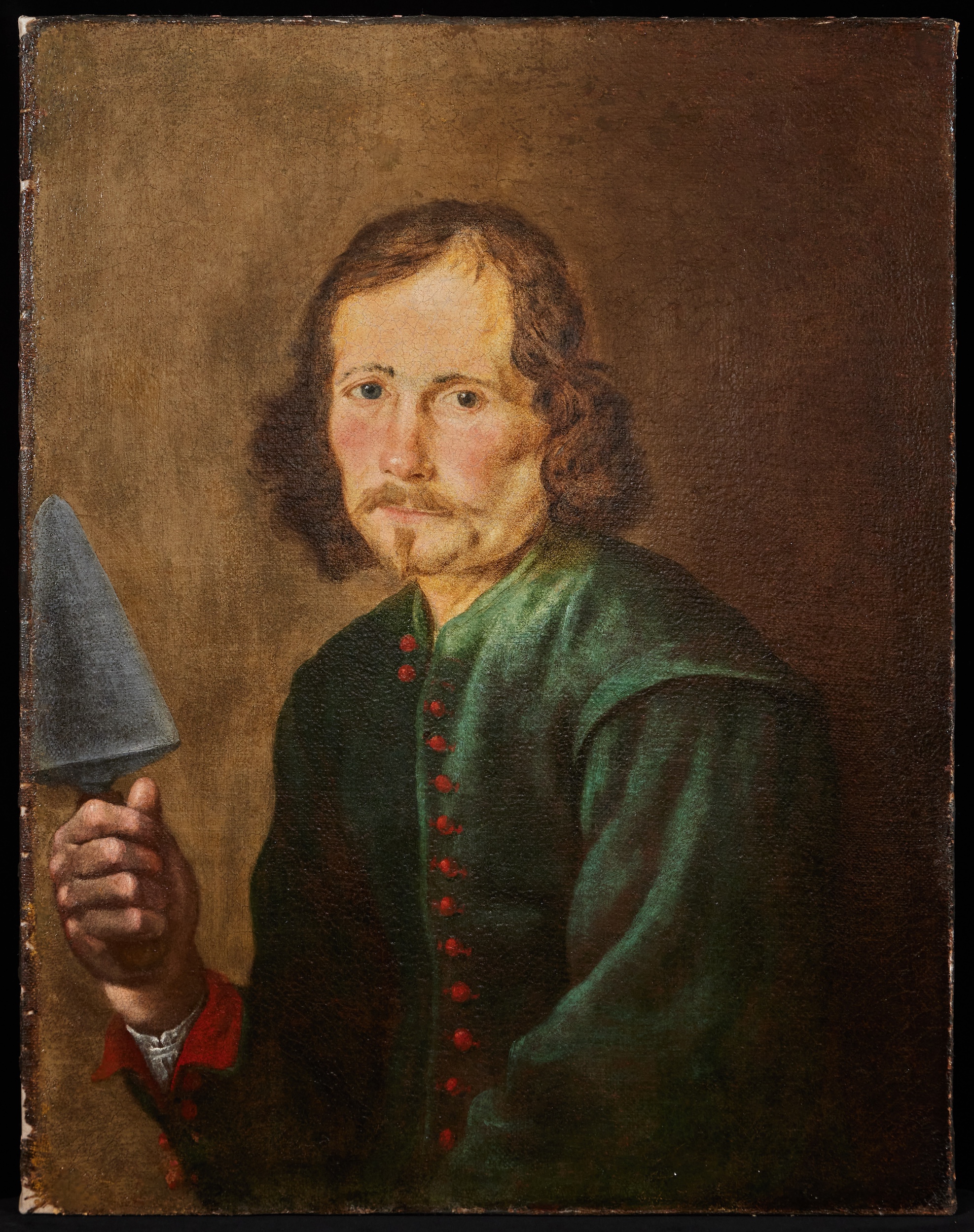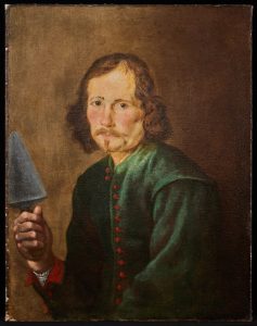 This portrait of a man can be identified as that of a Mason, as he holds a trowel, very prominently, in his right hand. Traditionally architects were portrayed holding a plan of one of their most celebrated buildings, whilst masons were given more practical attributes.