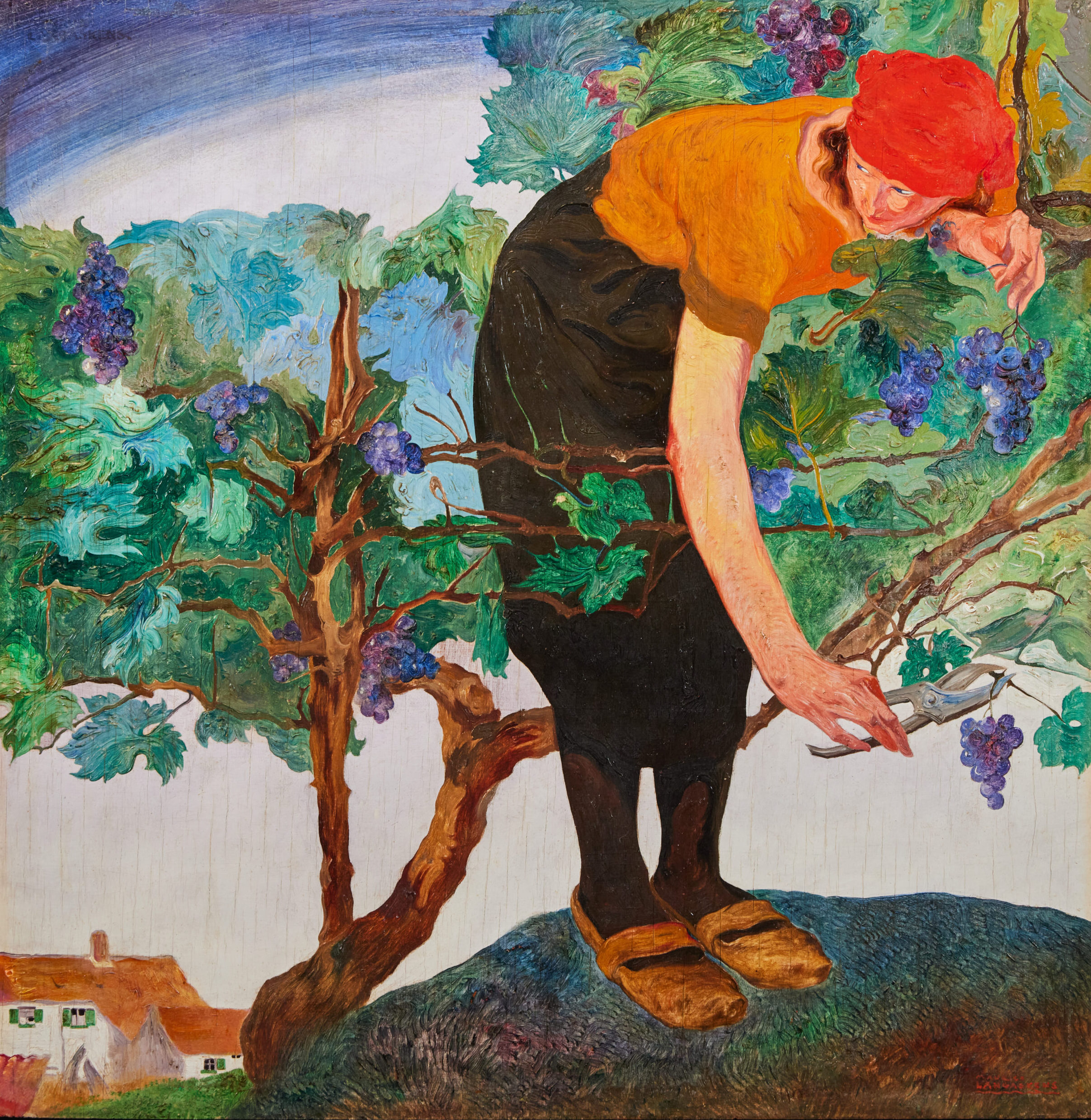 This scene of a young ‘Vendangeuse’ is typical of his subject matter after the War when he began to focus more on daily life and the jobs of his fellow countrymen and women. Some of his finest works show carthorses straining against their heavy loads in the snow and mud. Potentially it was painted as part of a series that were made for etchings such as the similar subject of ‘Le Cerisier’ (fig 1.) depicts an elderly man bent towards the cherry tree branch with his clippers in hand.