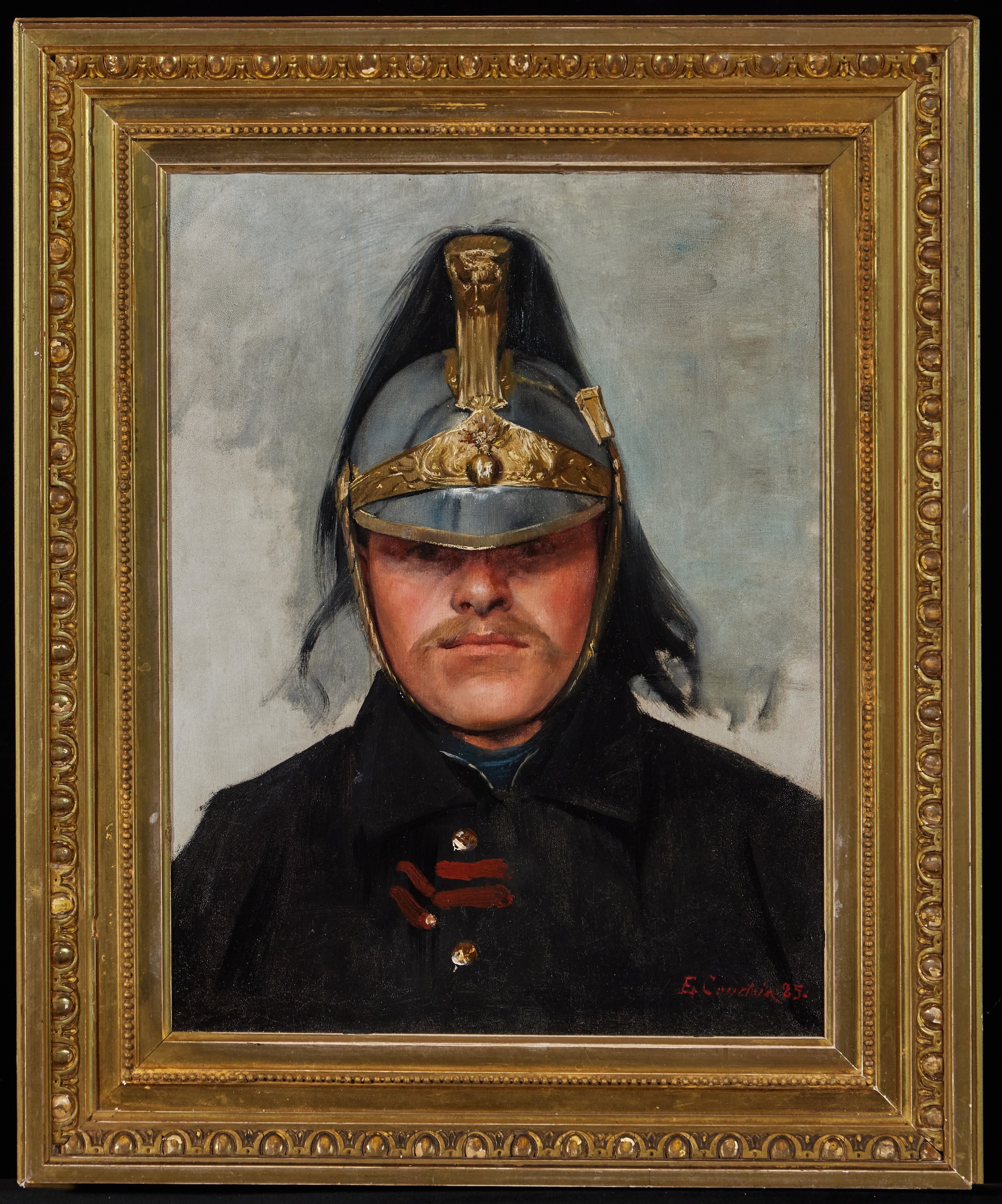 The young Dragoon wears his distinctive helmet with pride in this engaging portrait where we cannot but feel intrigued by his intense stare. The portrait seems shaped by the influence of Gérôme in its realism and its ability to give grandeur to a relatively simple subject.